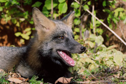 “Red” foxes actually come in several different colour phases. The typical red fox has a reddish coat, white-tipped tail, and black “stockings”. The white tail tip distinguishes this fox from other species, no matter what the colour phase. Several colour phases can occur in one litter. The phases are described by the coat colour: black, silver, and cross foxes. The silver phase is similar to the black colour, but it has silver-tipped guard hairs that give it its name. The cross phase has a dark (black/brown) “cross” over the shoulders and down the back. The dark phases are more common in the north, but are still unusual.