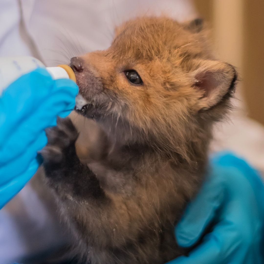 A juvenile red fox in care, one of multiple foxes that come in orphaned each year.